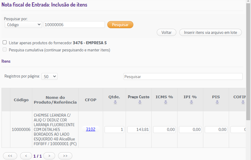 Após o ajuste realizado, o produto em questão já estará disponível e corrigido para ser adicionado à entrada de compra manual.