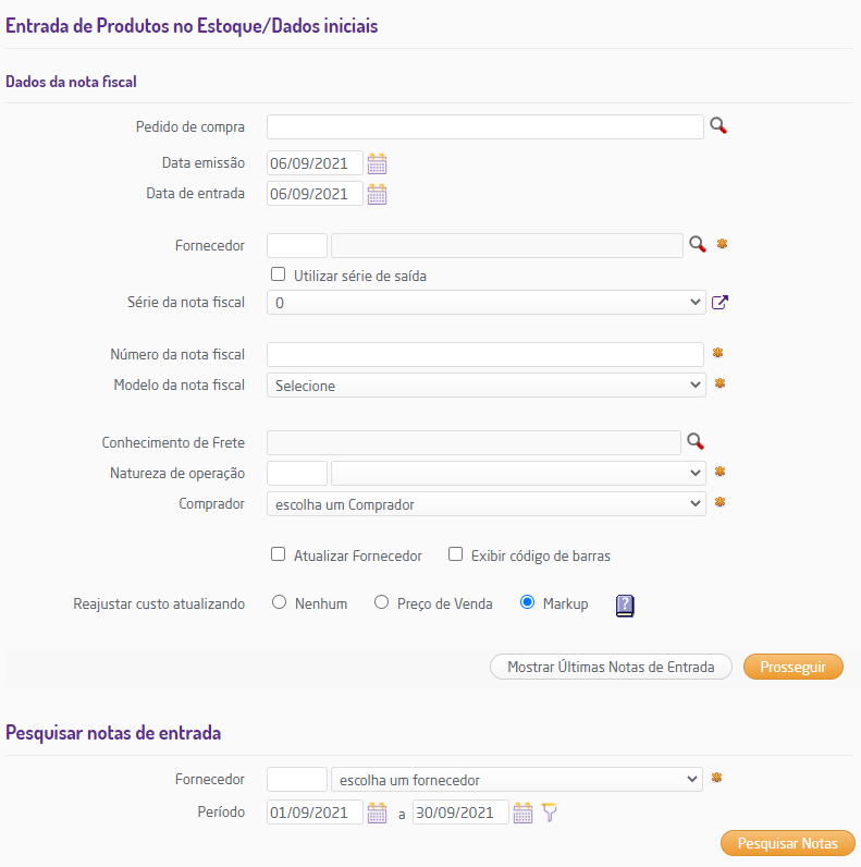 Ao acessar Suprimentos > Estoque > Entrada de Compras > Entrada Manual é possível fazer a entrada manual dos produtos e gerar a nota fiscal, ou pesquisar as notas fiscais de entrada.