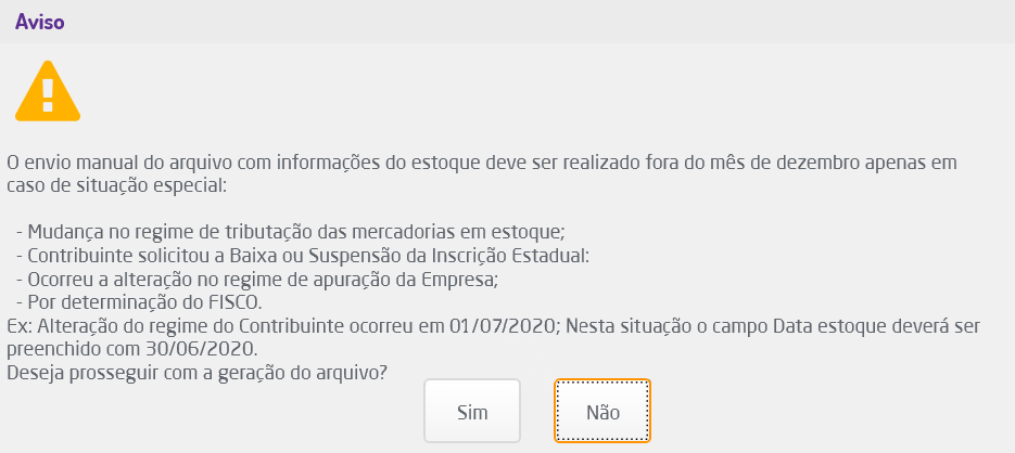 Ao solicitar a geração do arquivo, será exibida uma mensagem informando as situações em que o envio manual deve ser realizado e o usuário poderá confirmar se deseja enviar mesmo assim.