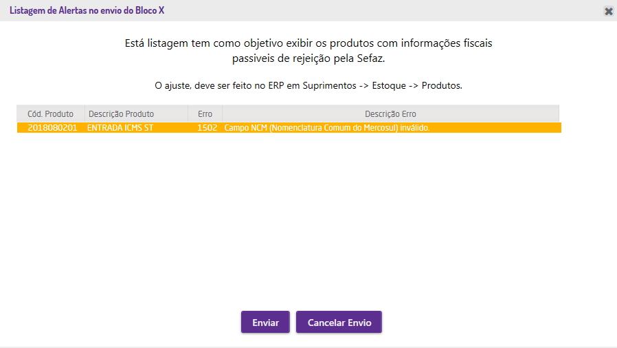 • Caso exista algum produto no arquivo com NCM ou GTIN inválido será exibida uma janela com um alerta e indicando como realizar o ajuste. Para que estas mensagens sejam exibidas é necessário que os parâmetros "Ativar validação de NCM" e "Ativar validação de GTIN" estejam marcados em Empresa > Parâmetros Globais > Grupo Obrigações Fiscais > Subgrupo Classificação dos produtos.