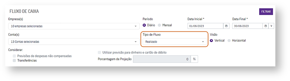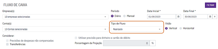 Ao exibir a tela de filtros de pesquisa defina os filtros necessários, no período correto, de forma que o campo “Tipo de Fluxo” esteja definido como “Realizado”,
