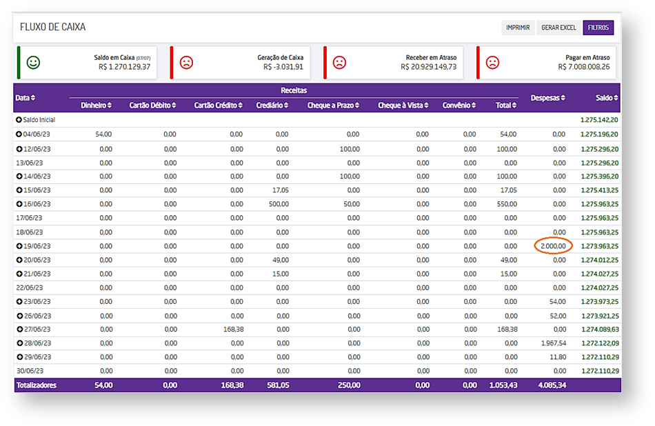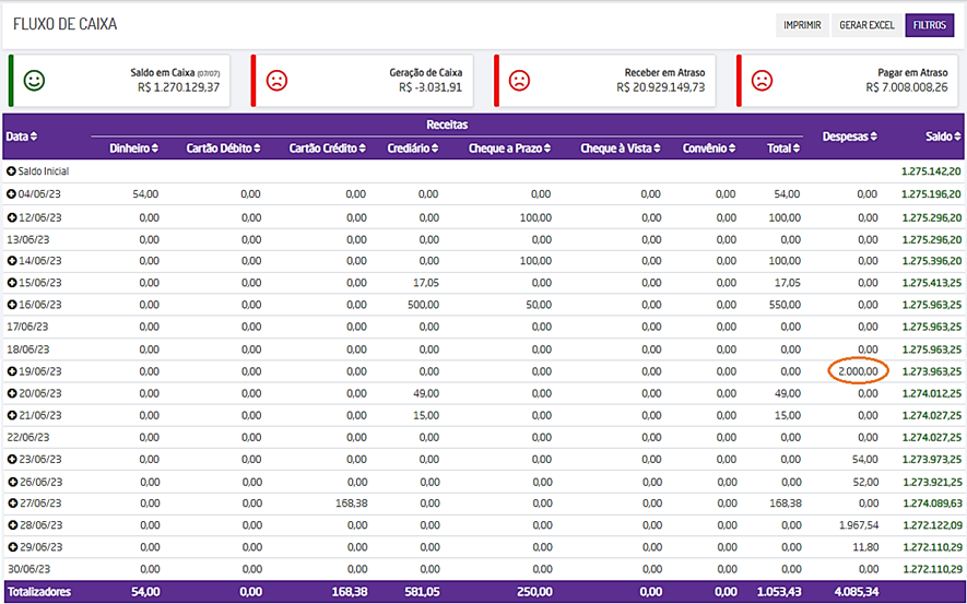 Será aberto o relatório de fluxo de caixa, contendo as informações