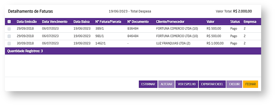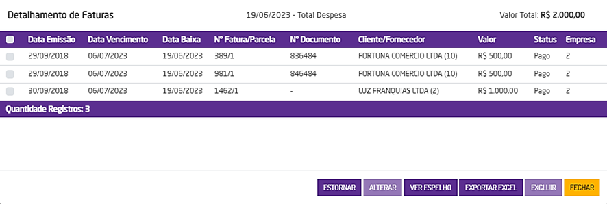 A tela de Detalhamento de Faturas, exibe a lista de faturas referentes à data do valor que foi clicado no relatório de fluxo de caixa.