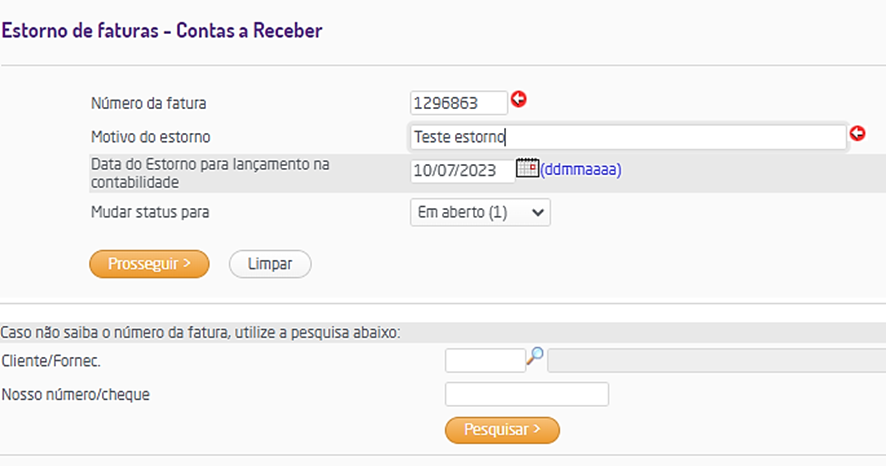 Então voltará para a tela inicial de estorno de fatura, onde poderá digitar uma nova fatura, na área de estorno, ou, fazer a pesquisa de fatura, na área de pesquisa.
