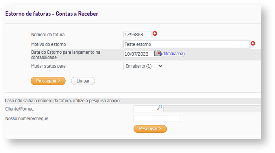 Caso o número da fatura não venha preenchido automaticamente nesta tela, e o usuário não saiba o número dela, é possível realizar uma pesquisa, pelo cliente ou fornecedor ou nosso número/cheque.