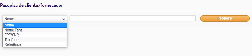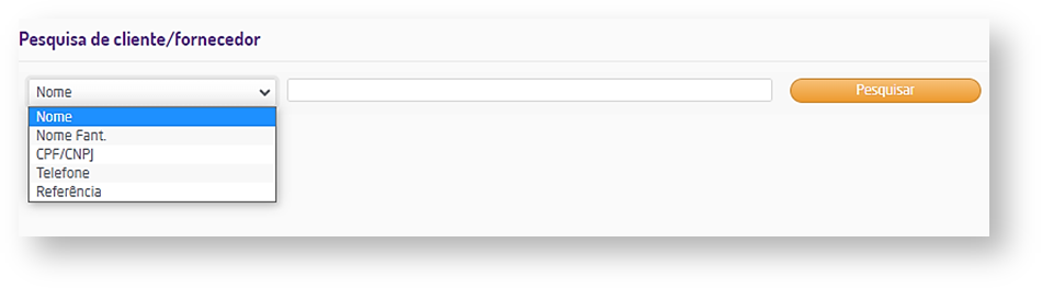 Ao clicar no ícone da lupa será aberta uma janela para execução da pesquisa pelo cliente ou fornecedor, onde é possível fazer o filtro da pesquisa, por Nome, Nome fantasia, CPF/CNPJ, Telefone ou Referência.