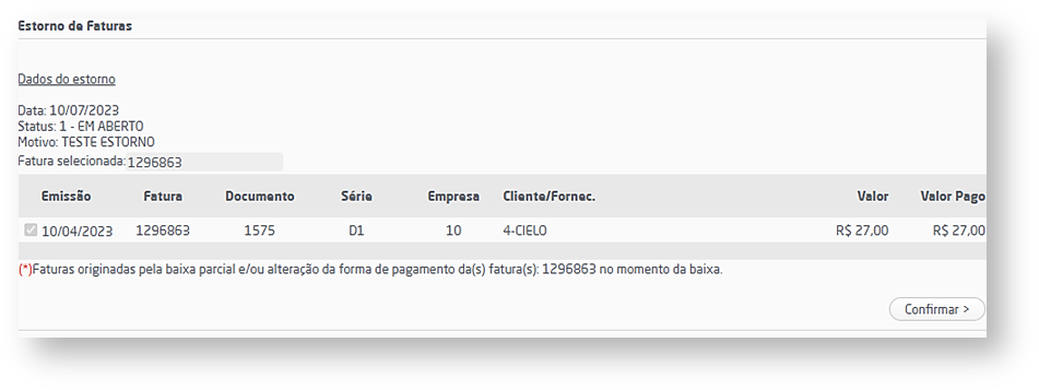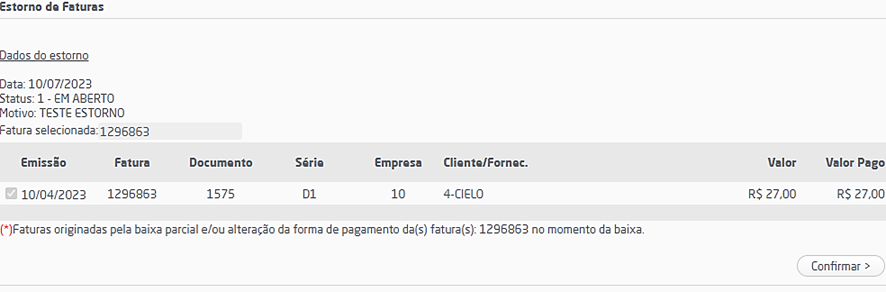 Conferência e confirmação de estorno de faturas