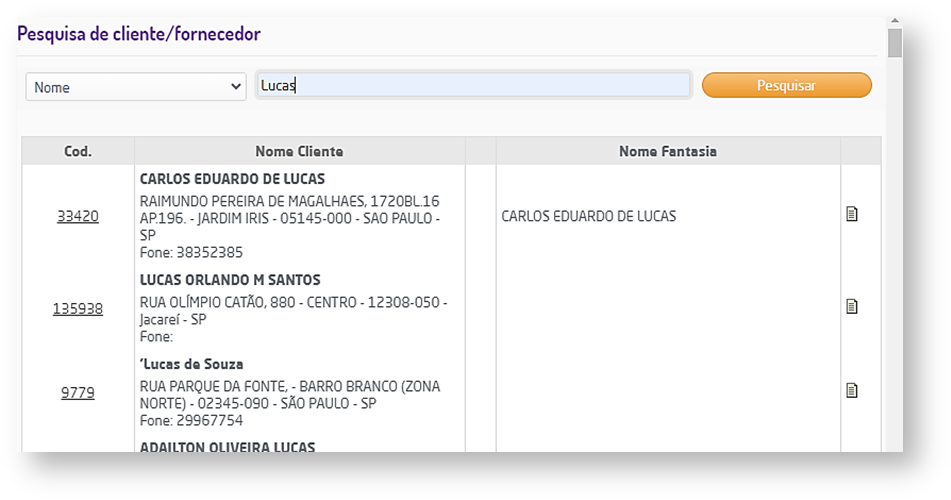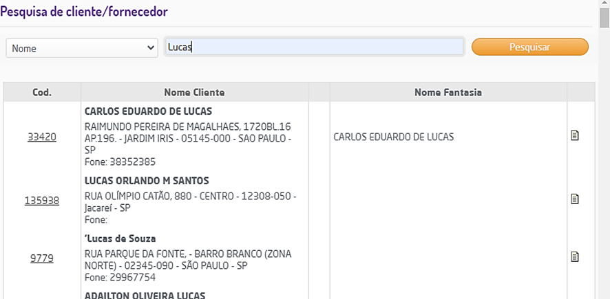 Será listado o resultado da pesquisa, informando o código, o nome do cliente/fornecedor e o nome fantasia