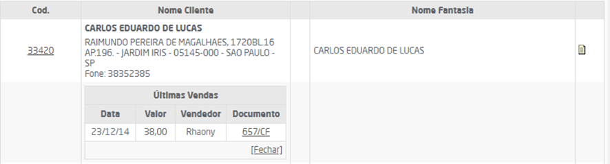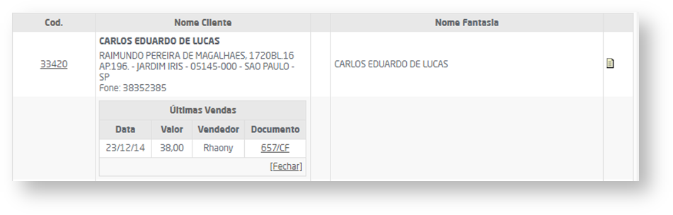 Ao clicar no ícone do lado, será informado um resumo das últimas vendas para o respectivo cliente/fornecedor.
