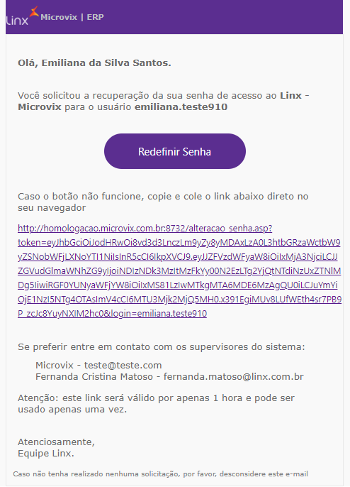 Para novos usuários, após o primeiro login, ao acessar novamente o Linx Microvix POS e acionar o "Esqueci minha senha" o sistema indicará dois usuários do portal com acesso à redefinição de senha, conforme imagem abaixo.