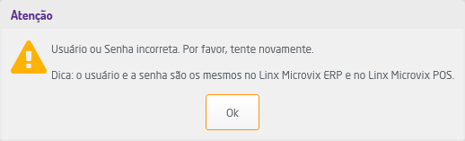 Caso a usuário ou senha informados estejam incorretos, será exibido o alerta abaixo.