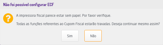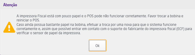 Caso a ECF esteja com falta de papel para a impressão de cupom fiscal, será exibido um alerta ao iniciar o POS.