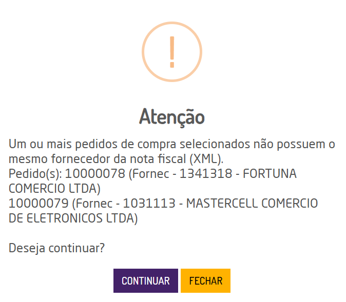 - Caso seja selecionado um pedido de compra com o fornecedor diferente do fornecedor do XML, ao finalizar a nota será informado em tela a divergência.