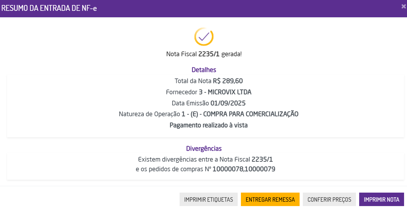 - Na finalização de uma entrada, caso a nota possua mais de um pedido de compra vinculado, existindo divergência entre a nota e ambos os pedidos, será exibida uma mensagem de divergência na tela final da nota fiscal gerada;