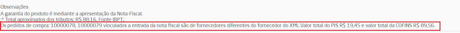 Além disso, no documento interno será exibida uma observação informando os pedidos de compra com fornecedores divergentes.