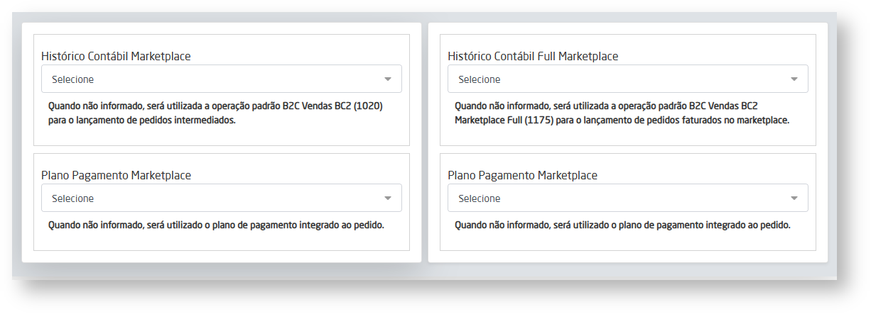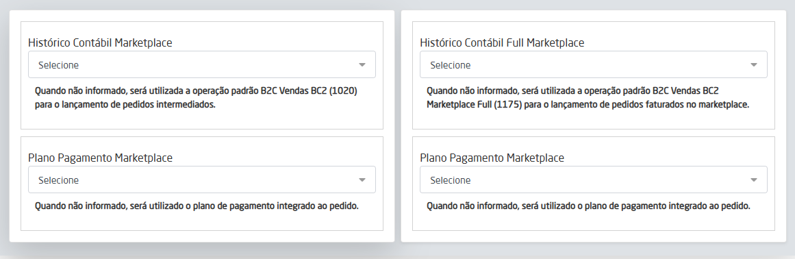- Histórico Contábil Marketplace; Quando não informado, será utilizada a operação padrão B2C Vendas BC2 (1020) para o lançamento de pedidos intermediados.