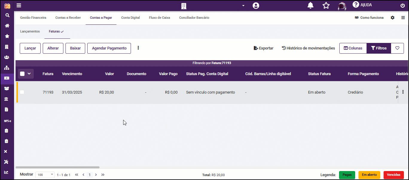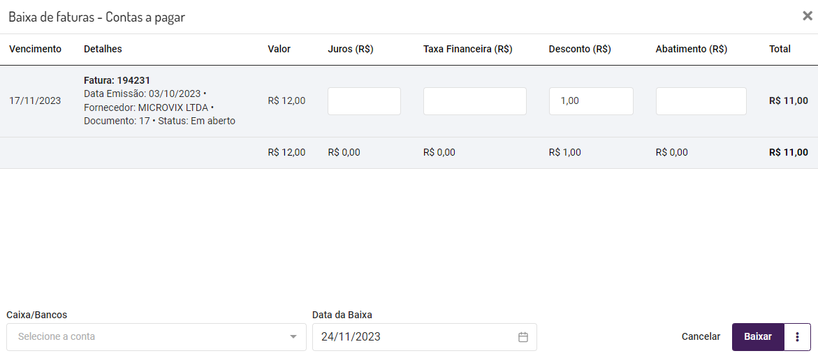 Tela de Baixa de Fatura