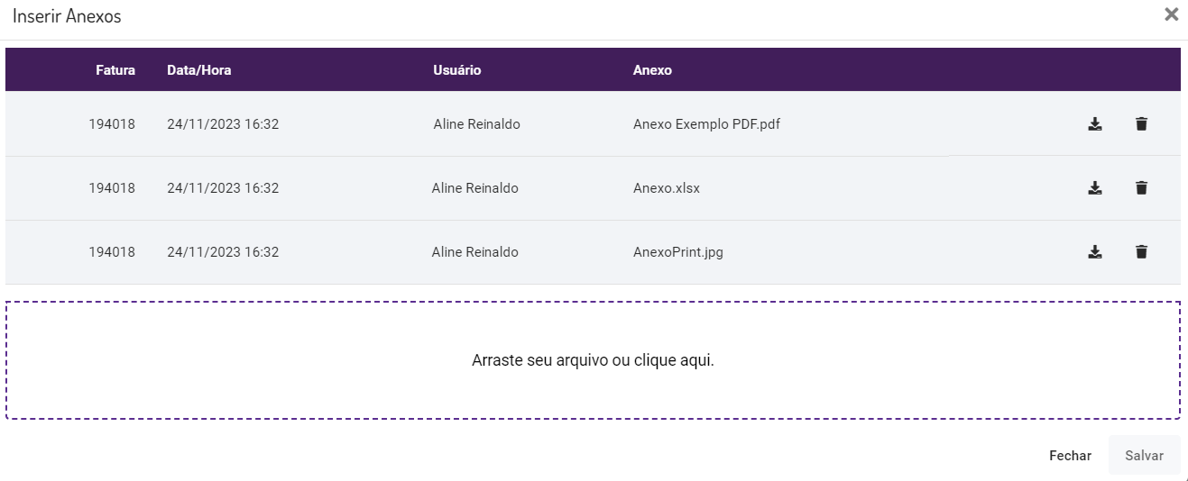 Caso a(s) fatura(s) selecionada(s) já possuam algum anexo, eles serão listados, com as seguintes informações: