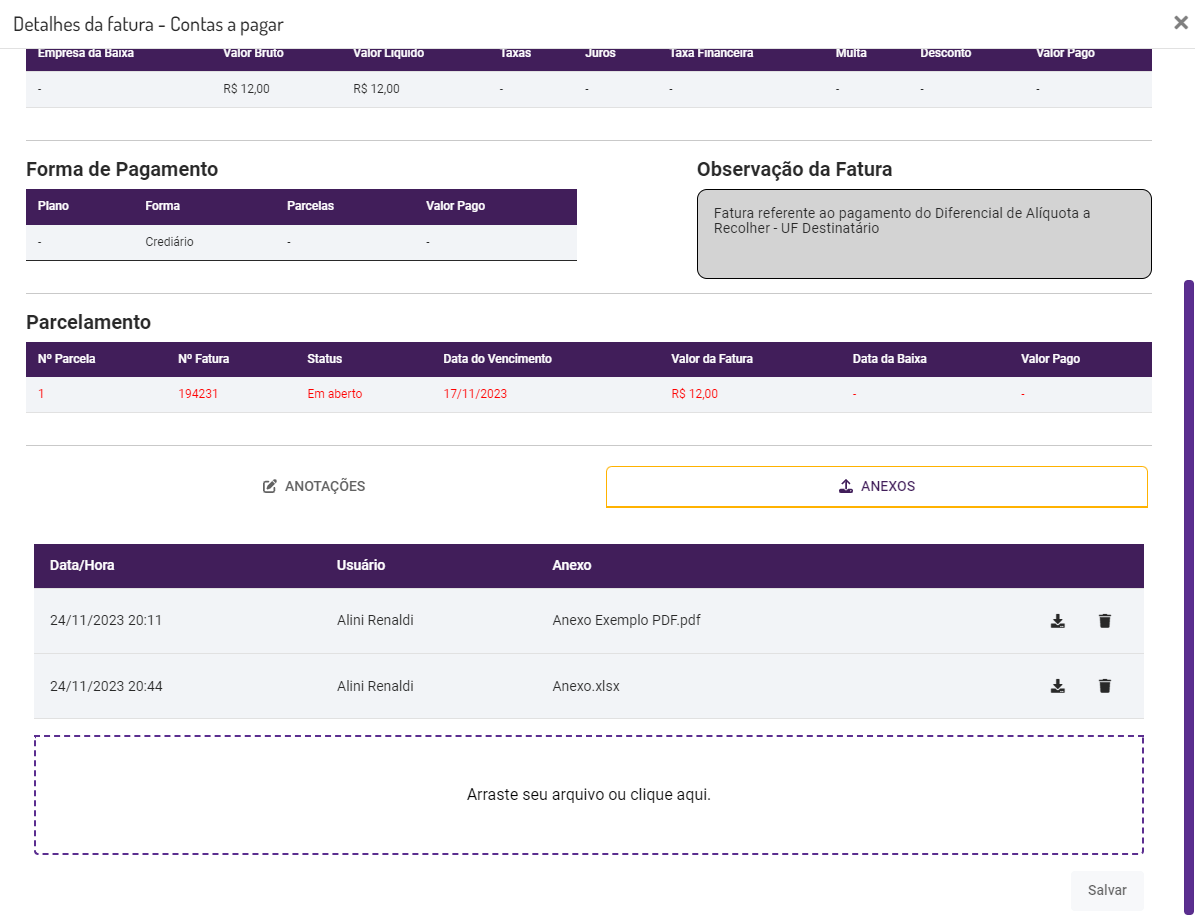 Também é possível incluir e gerenciar os anexos, na tela de Detalhes da Fatura.