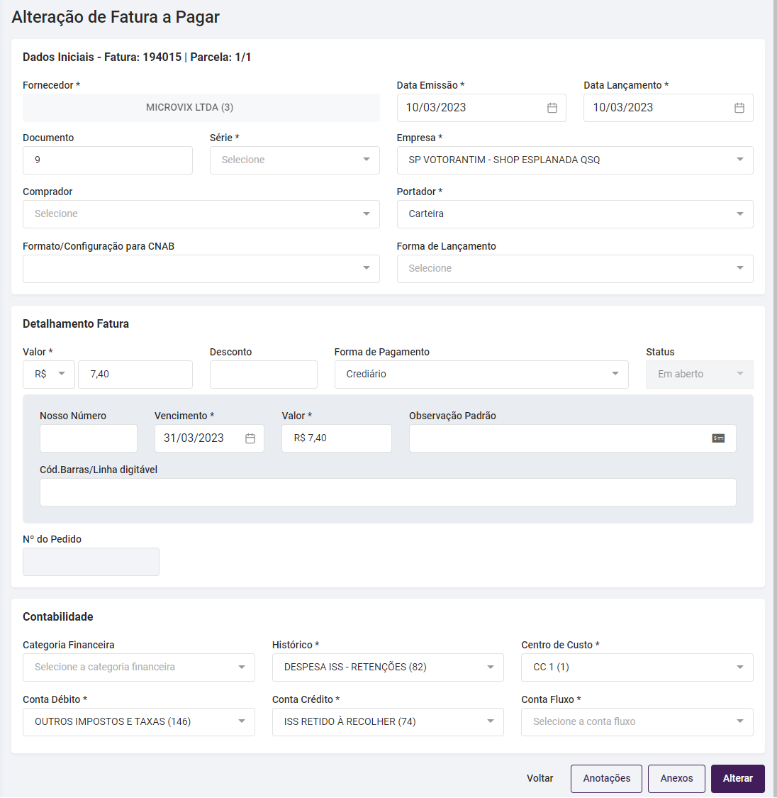 Também é possível incluir e gerenciar os anexos, na tela de Alteração de Fatura.