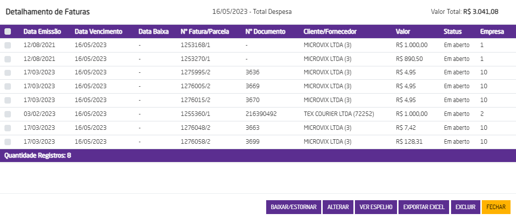 Na listagem são apresentadas as faturas que compõem o valor total a pagar, com os seguintes dados:
