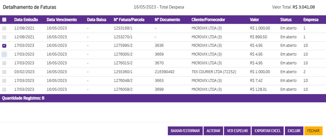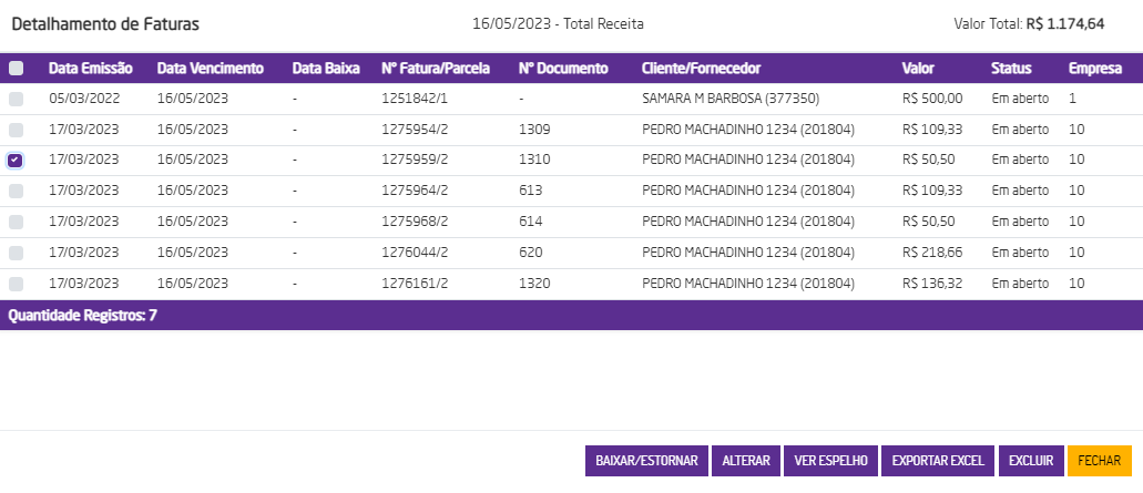 Ao clicar no botão "BAIXAR/ESTORNAR" será possível realizar a baixa individual de faturas. Para mais informações sobre a baixa de faturas clique aqui.