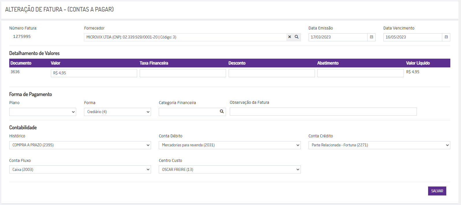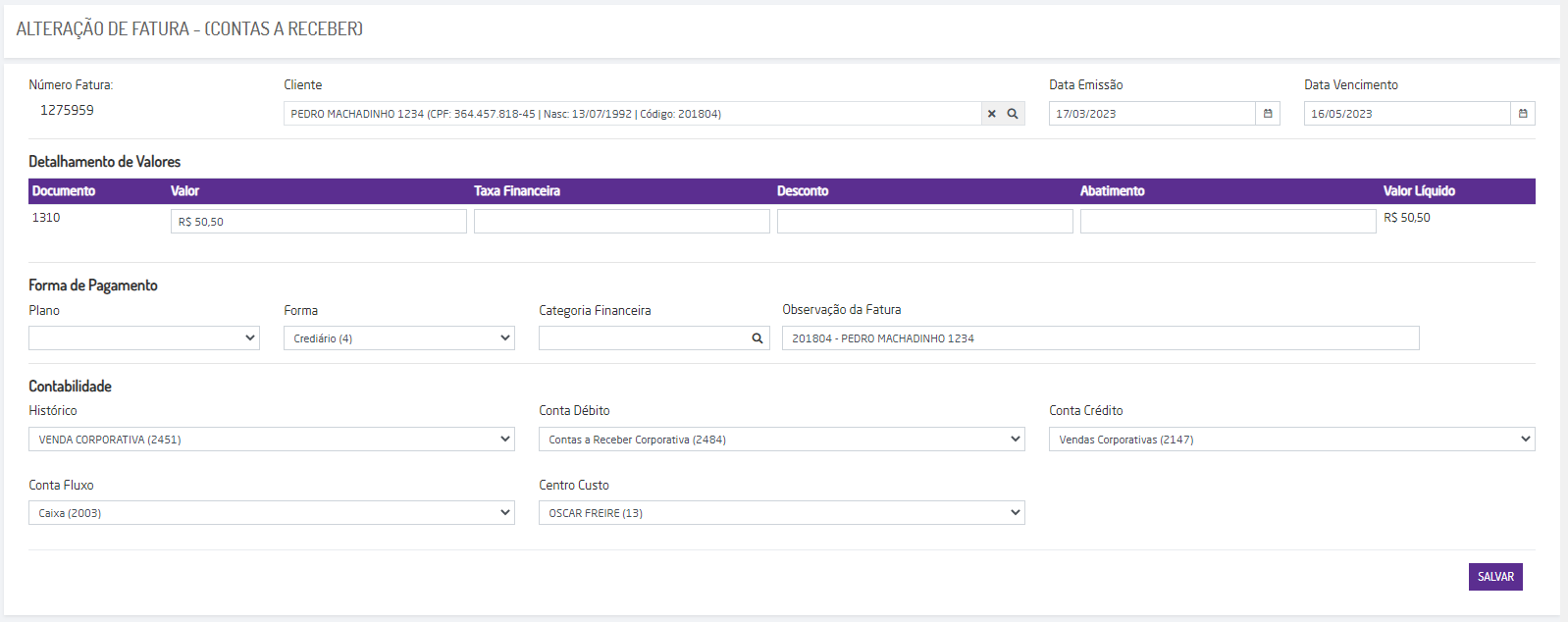 Após alterar os campos necessários, incluindo o detalhamento de valores, forma de pagamento e dados de contabilidade, clique no botão SALVAR. A fatura será salva com a alteração efetuada.