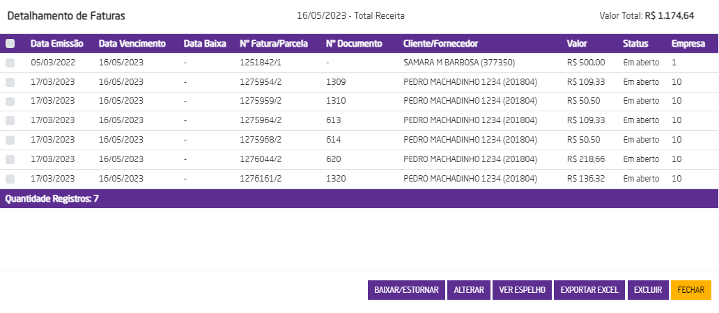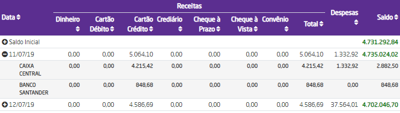 Nos valores de cada forma de pagamento referente a receitas, e nos valores de total por dia/mês, há um link para que seja possível acessar o detalhamento de faturas de cada forma de pagamento e de cada dia/mês. Neste detalhamento são exibidos: