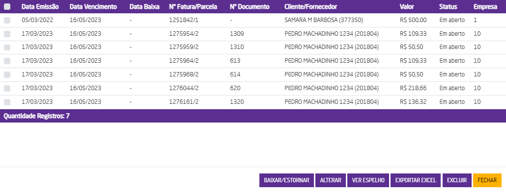 - Juros, Taxa Financeira, Multa, Desconto, Valor pago: neste caso, estes campos sempre serão apresentados em branco.
