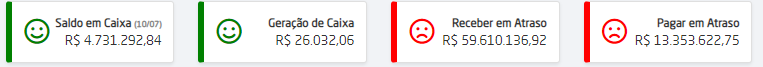 Neste totalizador é exibido o saldo em caixa do dia atual. Além disso, será exibido um emoticon feliz, caso o saldo seja positivo ou um emoticon triste, caso o saldo seja negativo.