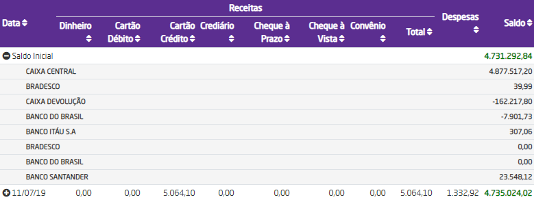 - Saldo Inicial: será apresentado o saldo inicial de todas as contas selecionada nos filtros. Através do ícone