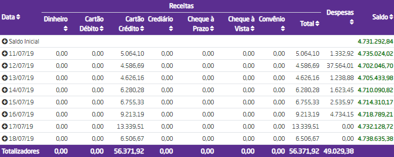 - Débito: será apresentado o total em débito previsto para recebimento. Somente serão exibidos valores para esta coluna caso o filtro "Utilizar previsão para dinheiro e débito" estiver marcado;