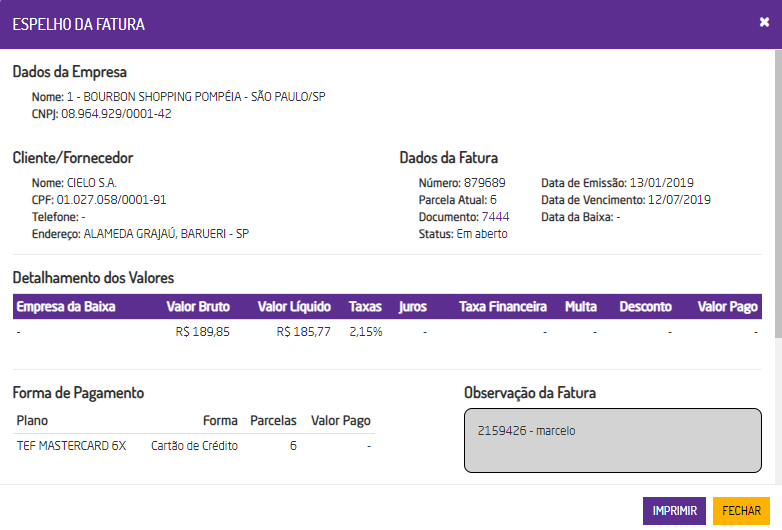 - Observação da fatura: será apresentada a observação sobre a fatura caso esta seja inserida no momento da geração.