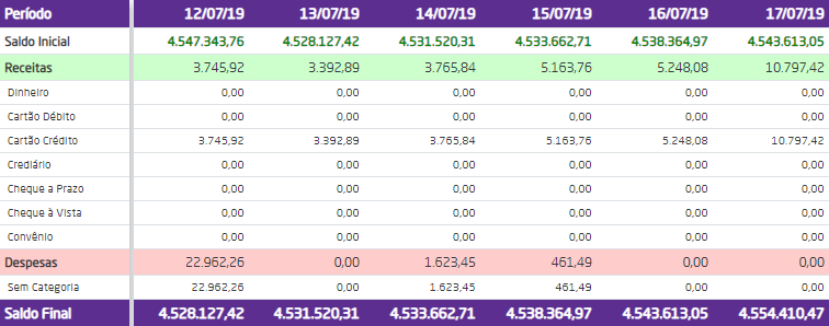 - Cartão de Crédito: será apresentado o total em cartão de crédito previsto para recebimento;