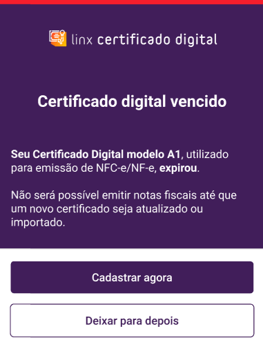 Não será possível emitir notas fiscais até que um novo Certificado Digital seja atualizado/importado.