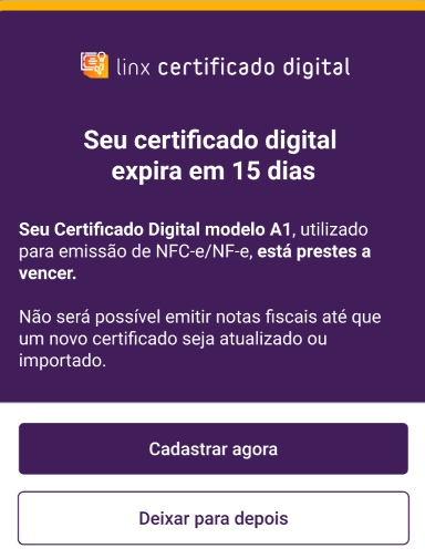 Quando o Certificado Digital de NF-e e NFC-e estiver expirado, próximo de expirar ou estiver vencido, na tela inicial será exibida uma notificação (conforme as imagens abaixo), para que seja feita a regularização.