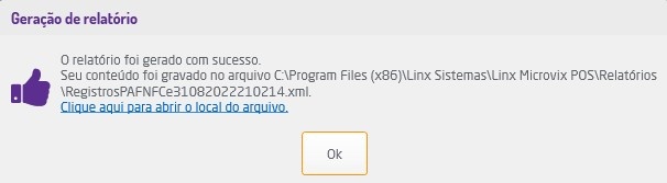 Ao clicar em "Gerar Relatório" o relatório será salvo automaticamente no computador e o sistema exibirá uma mensagem informando o local em que o arquivo foi salvo com o link para acessá-lo diretamente na pasta.