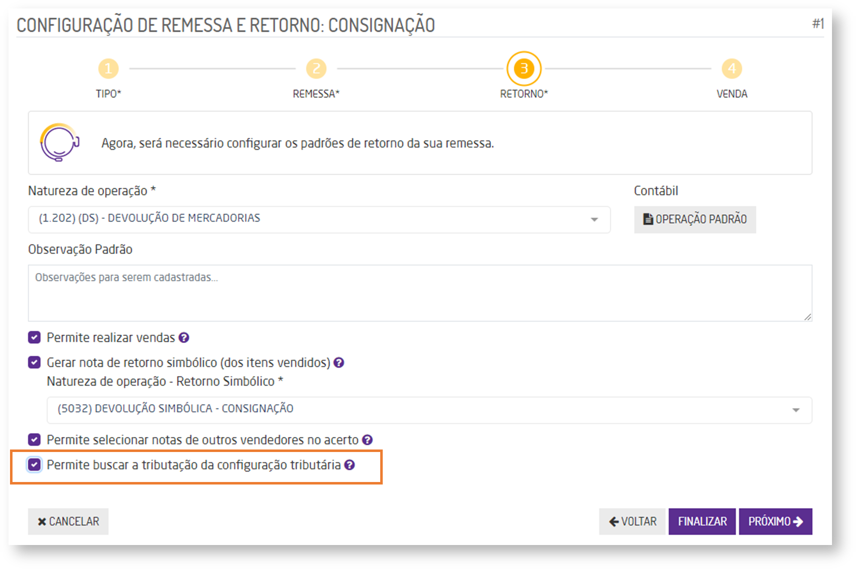 Ao marcar o campo, "Permite buscar a tributação da Configuração Tributária", o sistema passará a buscar os impostos parametrizados, na configuração tributária, para geração da nota de retorno simbólico e nota de devolução física.