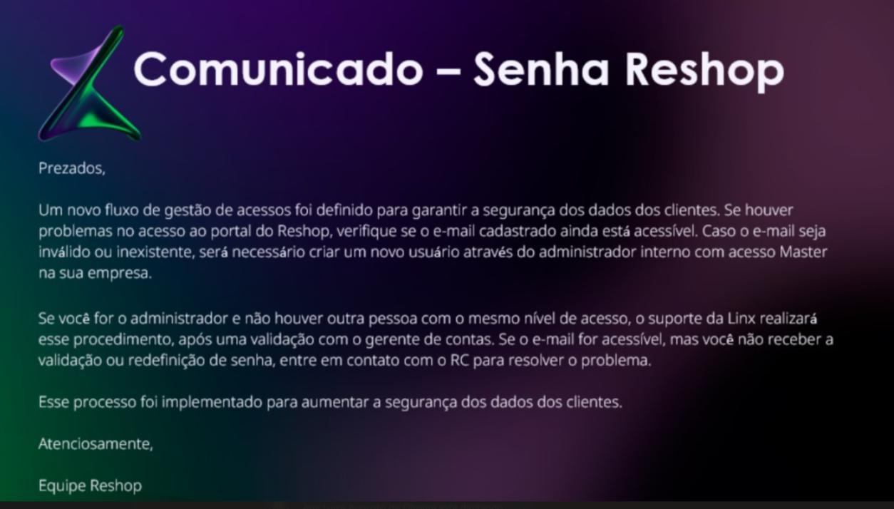 Problemas no acesso ao portal do Reshop
