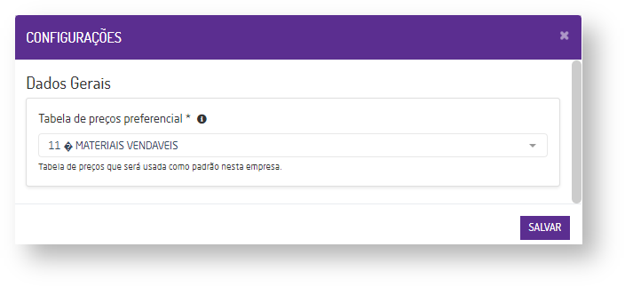 Para definir a tabela de preços preferencial, que será usada como padrão na empresa logada, clique o botão "CONFIGURAÇÕES", clique no campo, escolha a tabela e clique no botão "SALVAR".