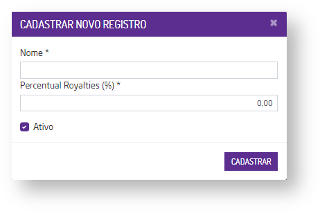 - +NOVO CADASTRO: poderá realizar o cadastro de um novo setor. Para isso, insira um nome, insira o valor percentual dos royalties (%), informe se ficará ativo no sistema e cliquei no botão "CADASTRAR";