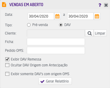 O link de pagamento poderá ser regerado através do relatório de vendas em aberto (Menu Gerencial > Vendas em Aberto > DAV), nas seguintes condições: