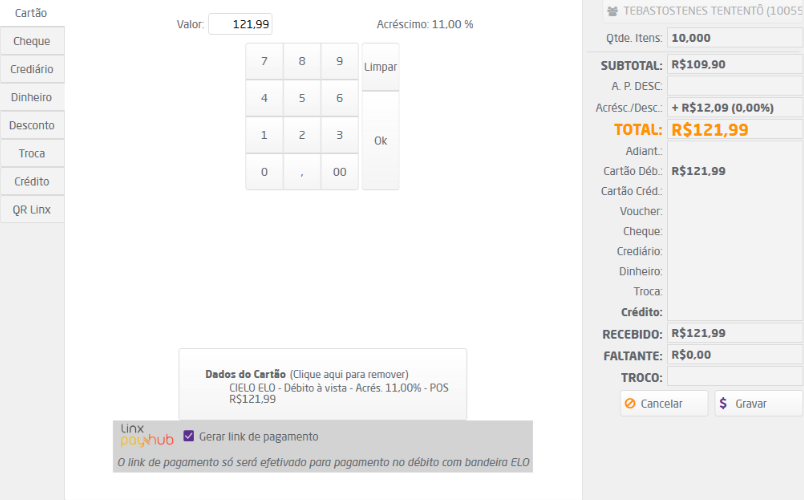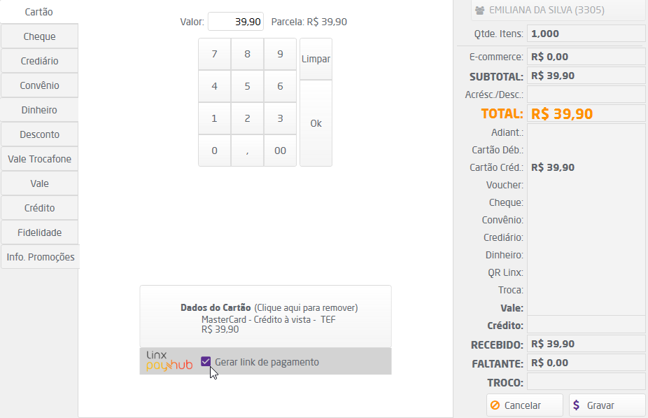 Desta forma, ao criar um DAV, na tela de pagamento, ao selecionar a forma "Cartão" e inserir o valor pago será habilitada opção "Gerar Link de Pagamento".