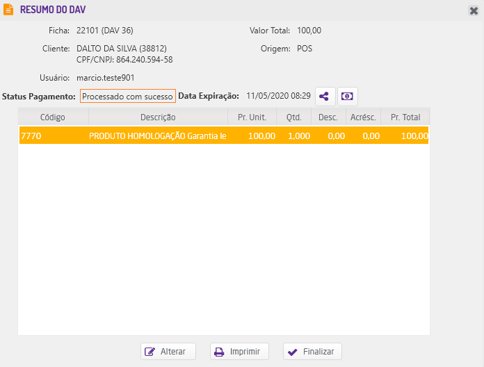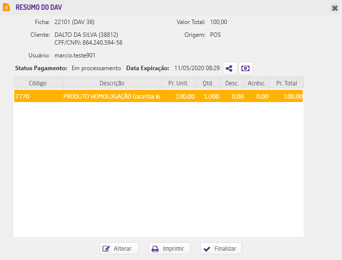 - Quando o link expirar será possível verificar esta informações no Resumo do DAV;