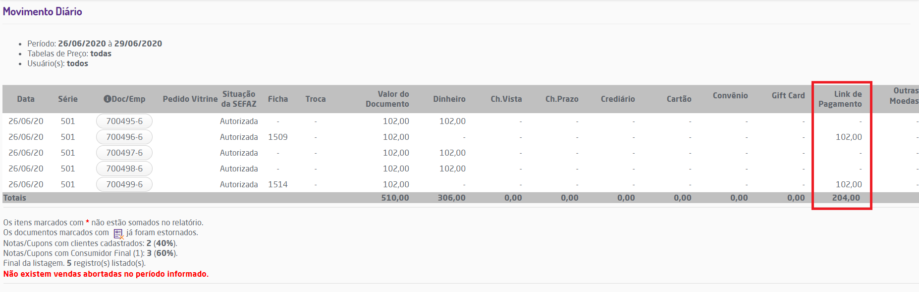 As informações das vendas realizadas utilizando link de pagamento poderão ser consultadas em: Relatórios > Acessar > Fontes de Dados: Faturamento por Vendas ou Faturamento por item. Ao gerar estes relatórios serão exibidas as informações se a venda foi ou não gerada com o link e o valor. Além disso, no Relatório de Movimento Diário foi adicionada uma coluna denominada "Link de Pagamento" na qual apresentará as operações efetivadas com o link.