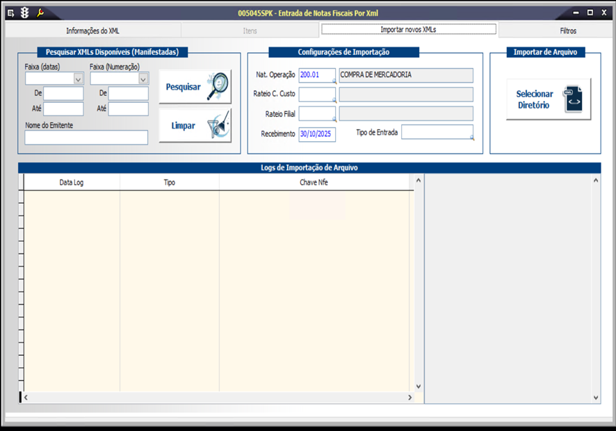 Ao usar o XML das Notas manifestadas pela tela 005025SPK: Consultar a NF, clicar no botão IMPORTAR XML.