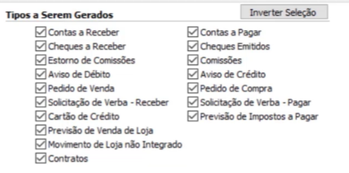 Botão inverter seleção: inverte a seleção marcada. Exemplo, se eu desmarcar contas a receber e contas a pagar e pedir para inverter, o sistema automaticamente desmarca as demais condições e deixa somente marcado contas a receber e contas a pagar.
