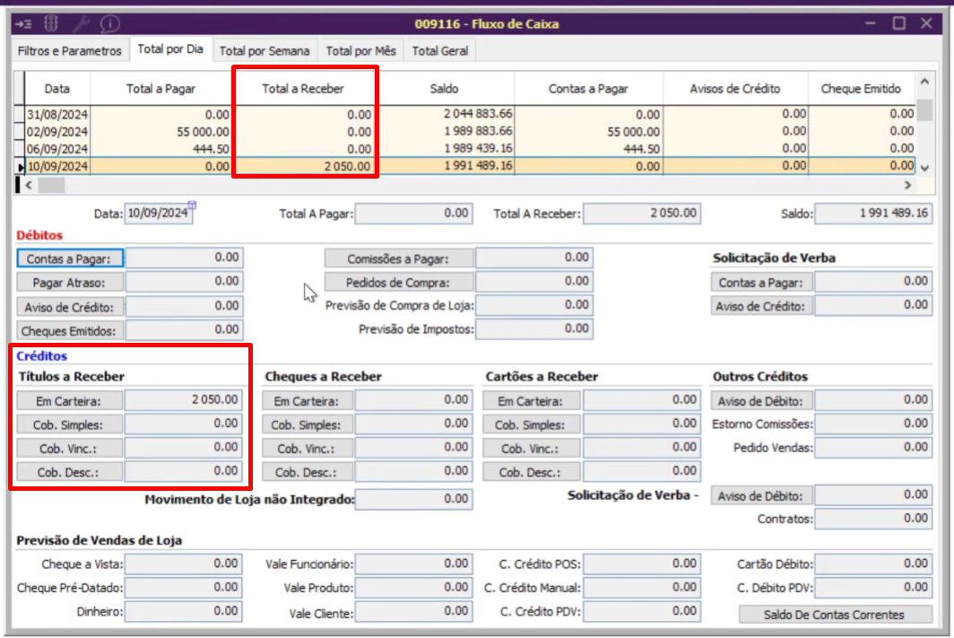 Tela 00916 fluxo de caixa tem por finalidade demonstrar todos os pagamentos e recebimentos esperados em um determinado período, ou seja, apresenta uma visão geral sobre todas as funções da empresa, como: pagamentos, recebimentos, compras, solicitação de verba, aviso de crédito, aviso de débito, entre outros.