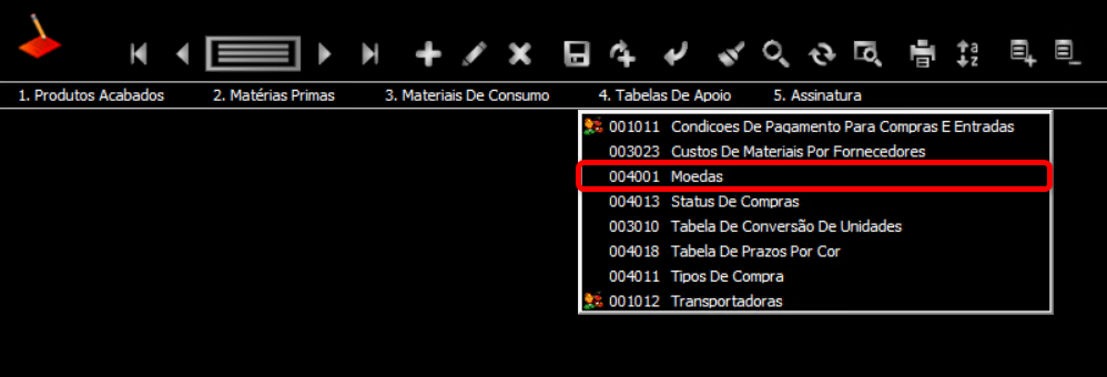 3. Selecione Tabelas De Apoio > 004001 Moedas para abrir a tela.