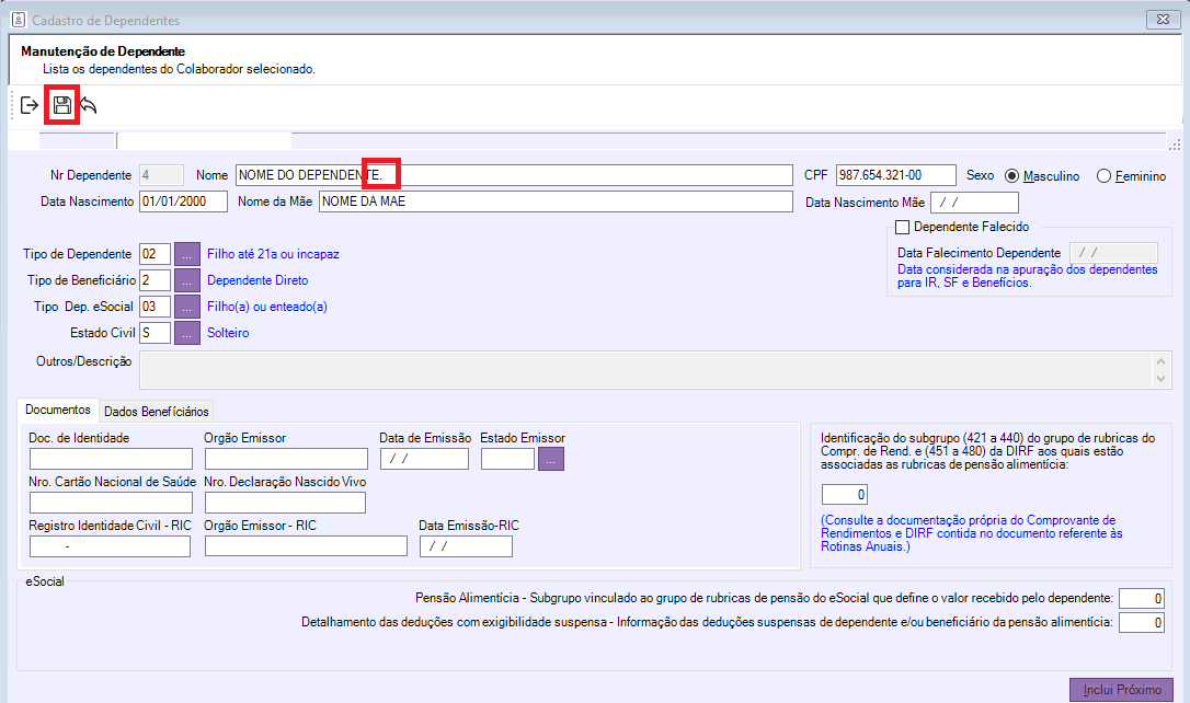A exclusão deve ser realizada por meio da geração do evento S-3000 (Evento de Exclusão). - Alterar o cadastro do dependente